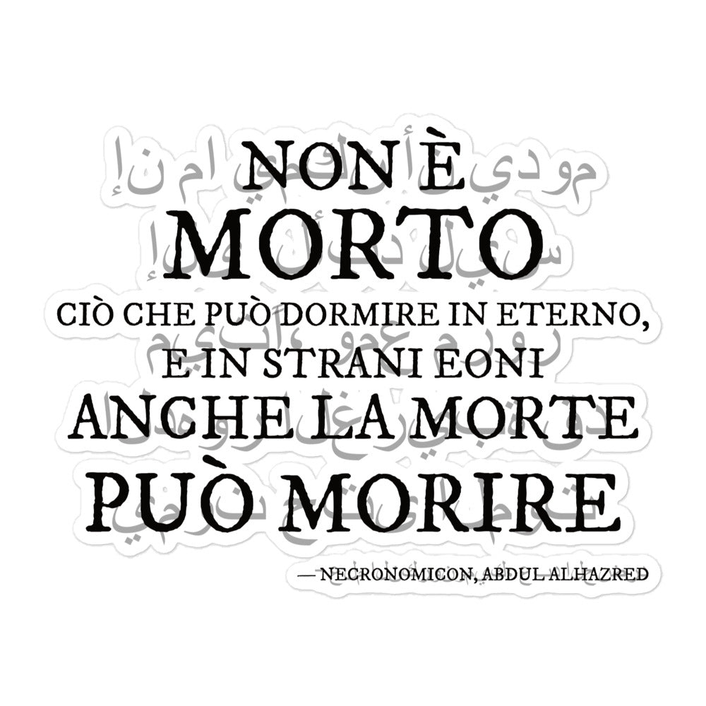 „Non è morto…“ – Die Rückseite des Necronomicon auf Arabisch und Italienisch. Adesivi con applicazione bolle