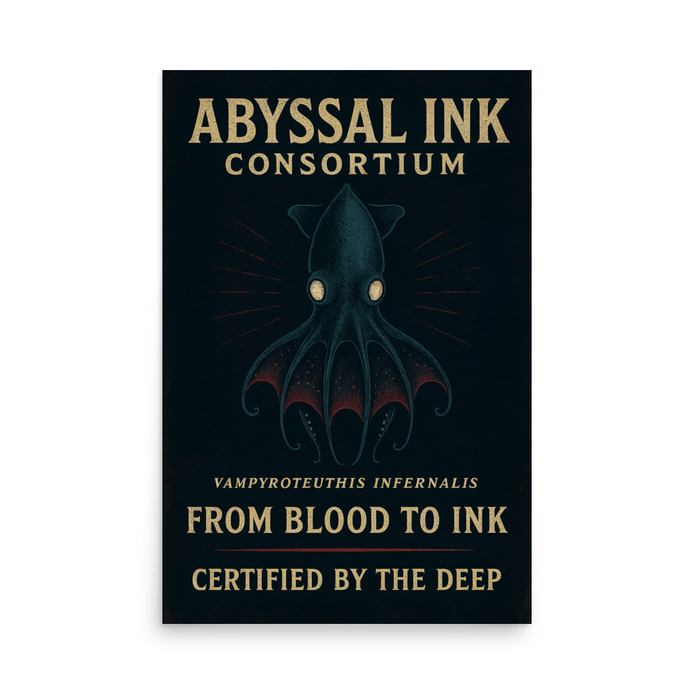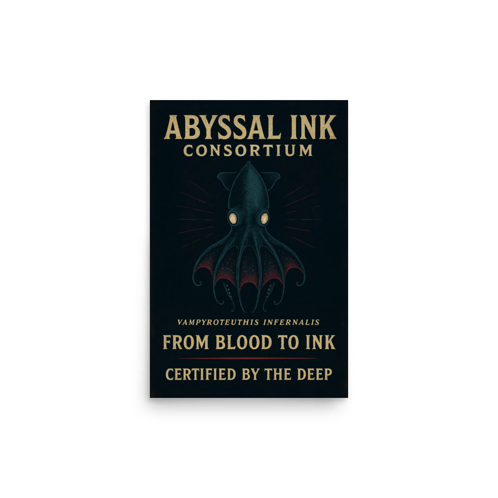 Dive into the darkness with this vintage-style poster for the Abyssal Ink Consortium. Featuring the enigmatic Vampyroteuthis infernalis, this design blends deep-sea horror with antique scientific charm. "From Blood to Ink – Certified by the Deep" captures the eerie magic of the abyss, perfect for collectors of marine myths and Lovecraftian lore.