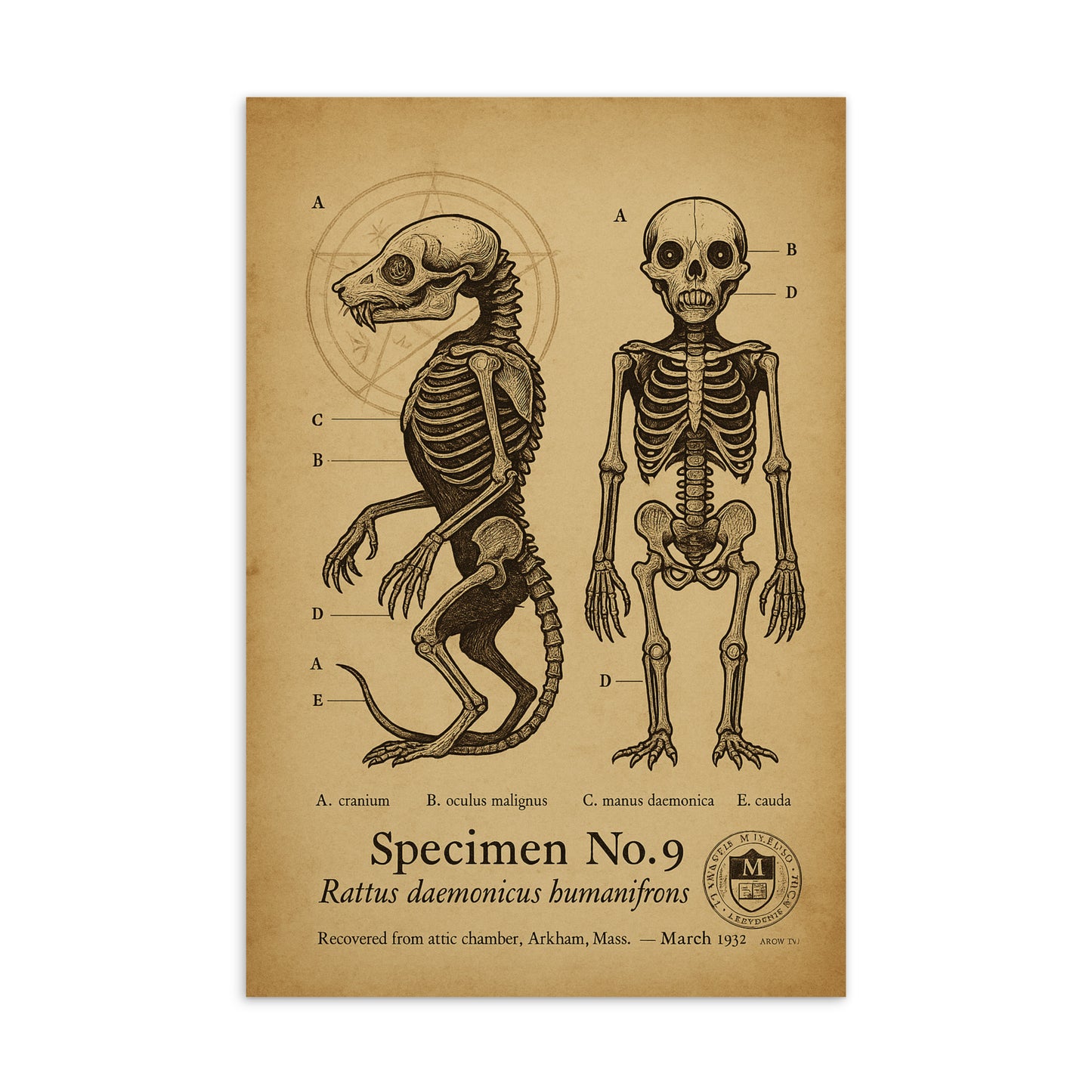 This vintage-style scientific illustration presents the alleged skeletal remains of Brown Jenkin—discovered in the attic of the Witch House in Arkham. Cataloged under the Miskatonic University Occult Archive, Specimen No. 17 showcases the disturbing blend of rodent and human morphology. A chilling relic of arcane horrors and forbidden rituals.