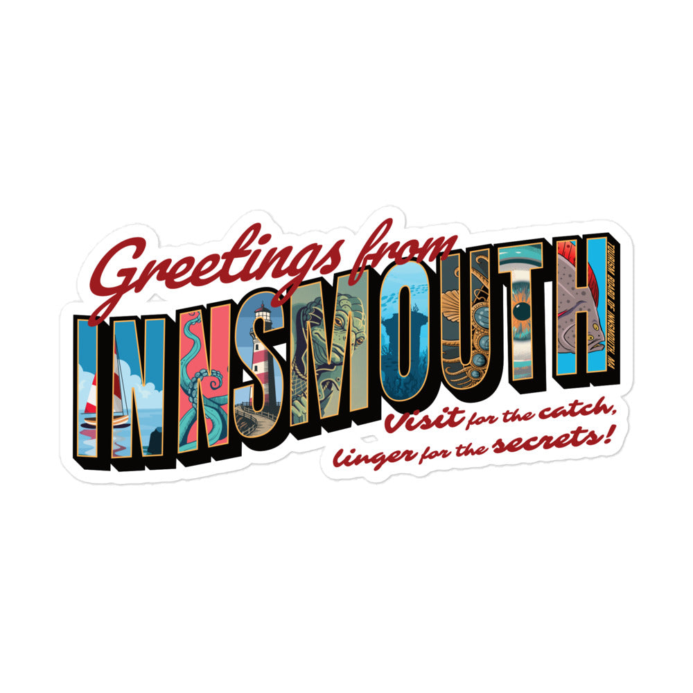 A large‑format "Greetings from Innsmouth" travel‑poster featuring retro letter‑inlay scenes of coastlines, lighthouses and fishing life with subtle, unsettling Lovecraftian motifs. Flat colors, strong silhouettes and halftone textures evoke a nostalgic vintage postcard aesthetic. The design marries classic seaside tourism imagery with an undercurrent of uncanny maritime menace.
