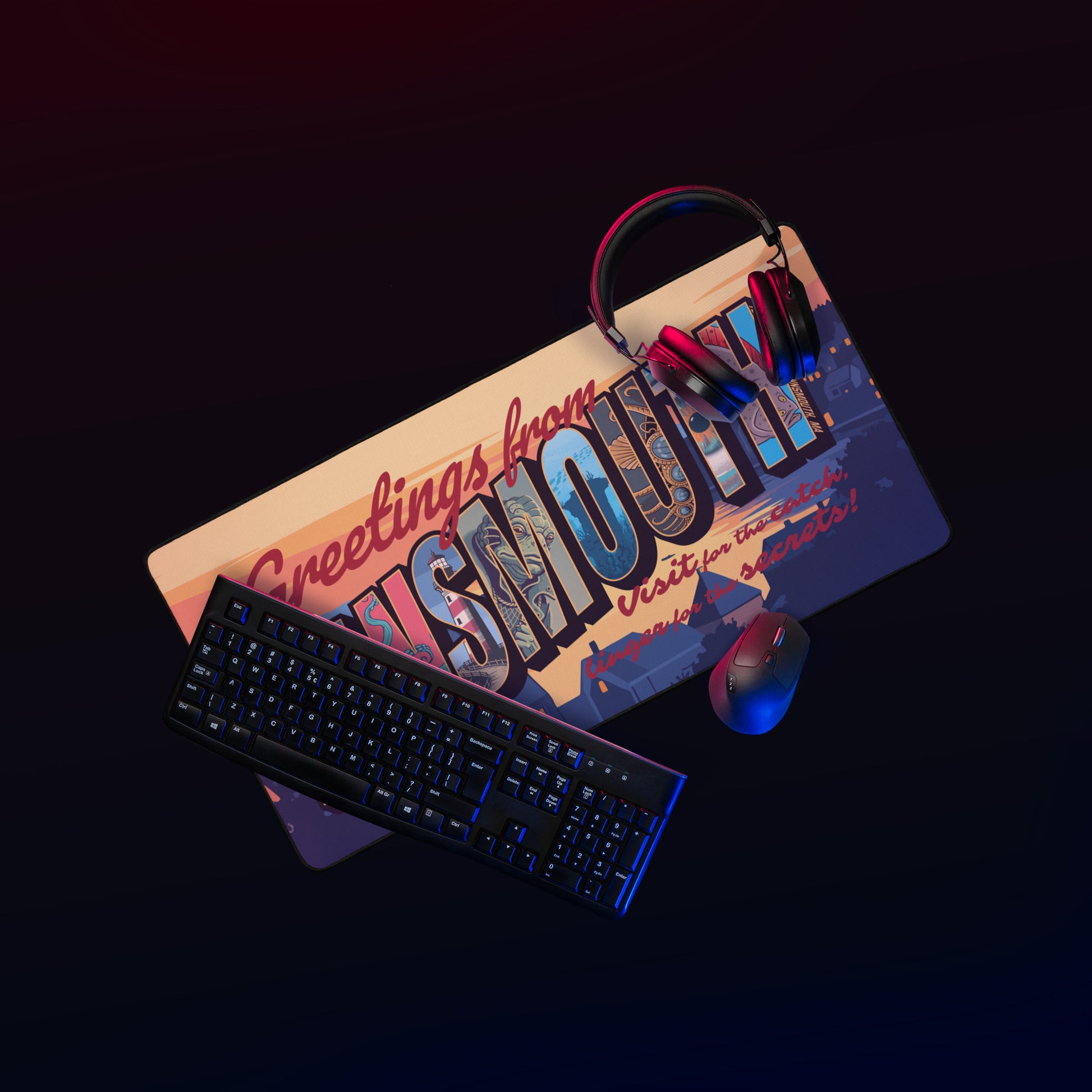 A large‑format "Greetings from Innsmouth" travel‑poster featuring retro letter‑inlay scenes of coastlines, lighthouses and fishing life with subtle, unsettling Lovecraftian motifs. Flat colors, strong silhouettes and halftone textures evoke a nostalgic vintage postcard aesthetic. The design marries classic seaside tourism imagery with an undercurrent of uncanny maritime menace.