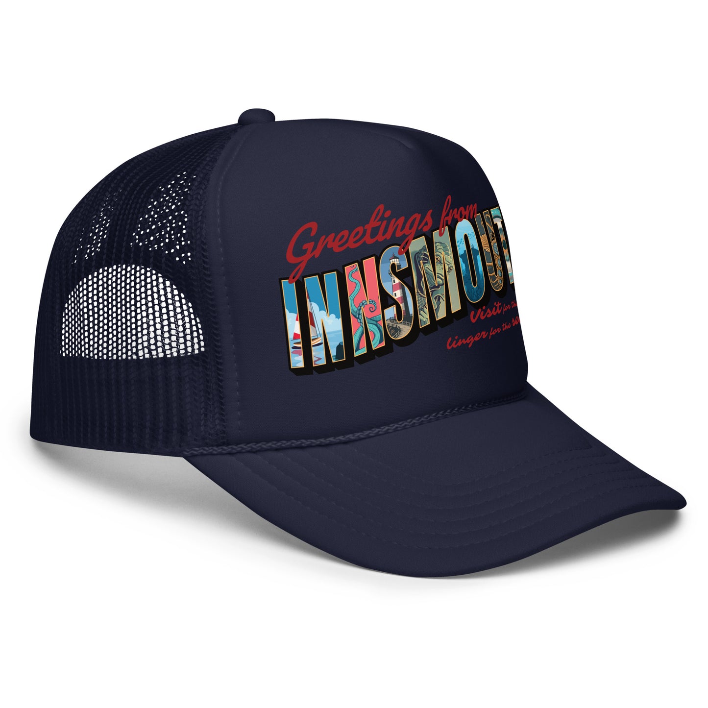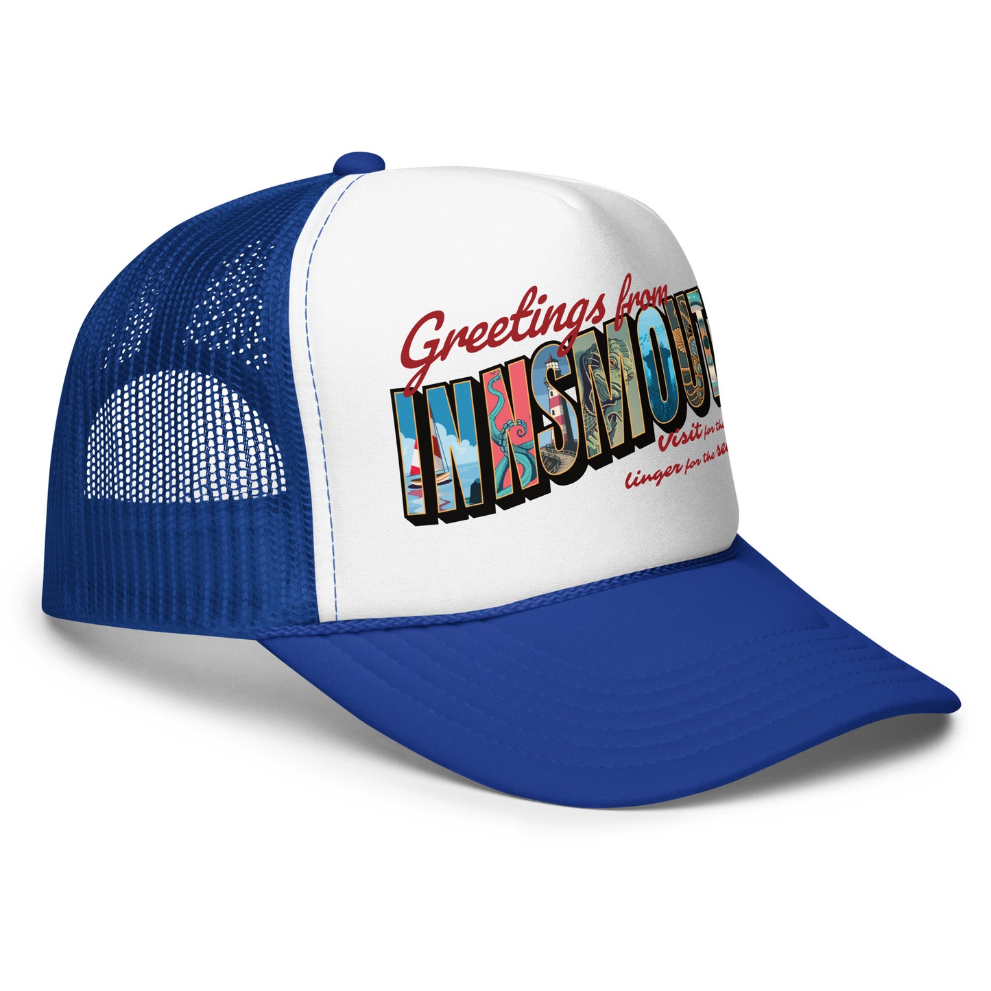A large‑format "Greetings from Innsmouth" travel‑poster featuring retro letter‑inlay scenes of coastlines, lighthouses and fishing life with subtle, unsettling Lovecraftian motifs. Flat colors, strong silhouettes and halftone textures evoke a nostalgic vintage postcard aesthetic. The design marries classic seaside tourism imagery with an undercurrent of uncanny maritime menace.