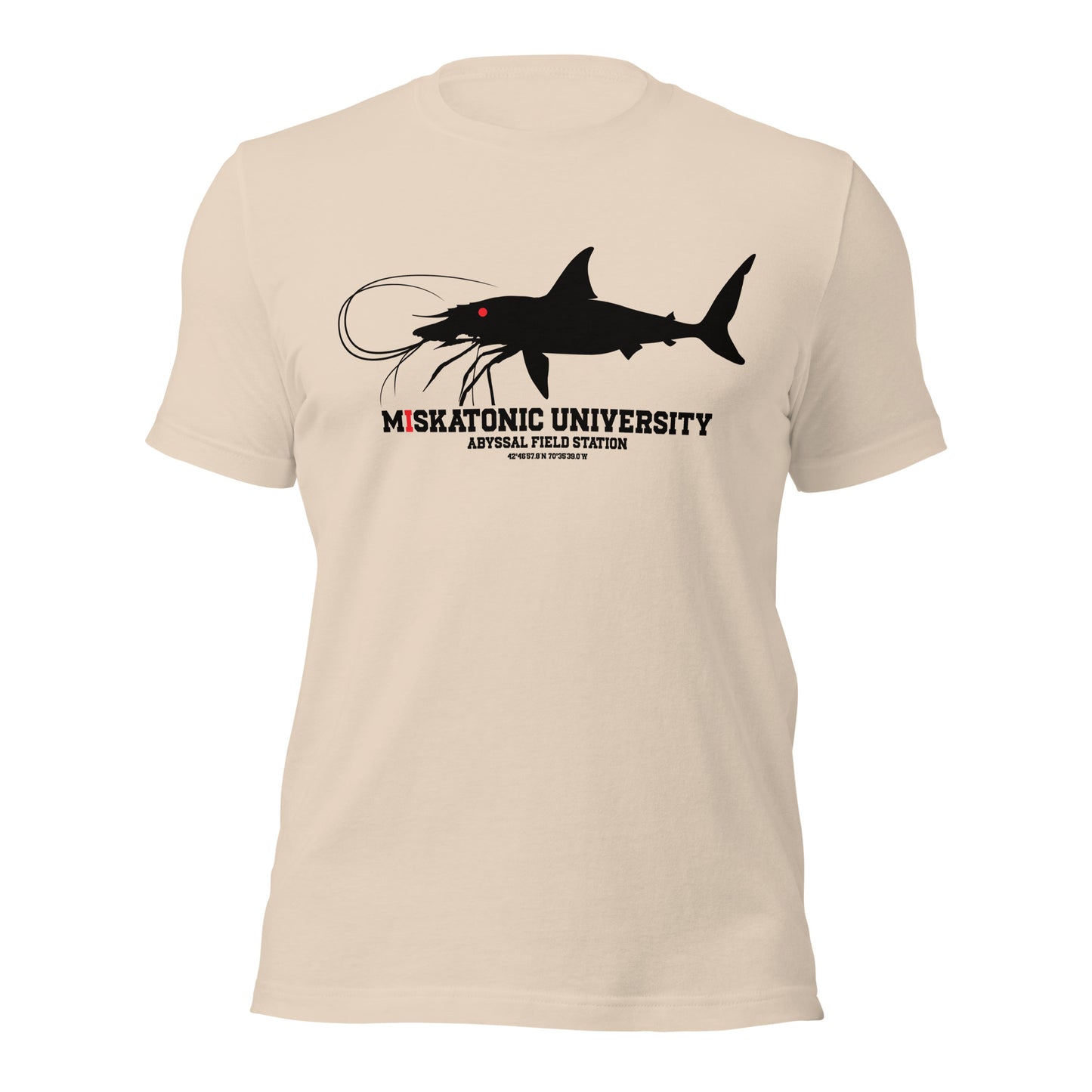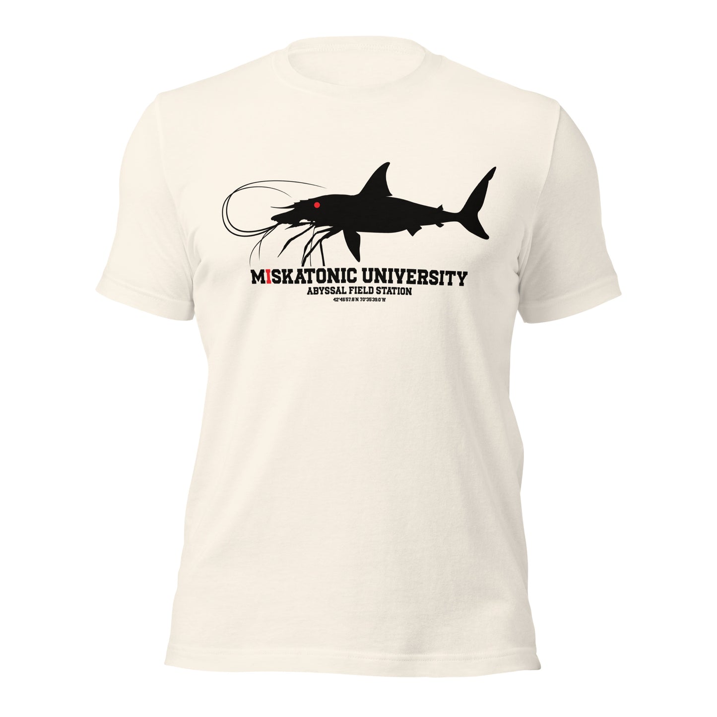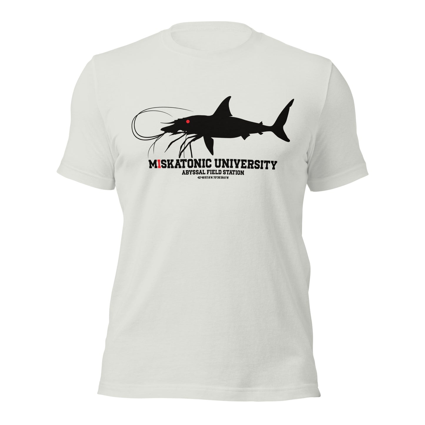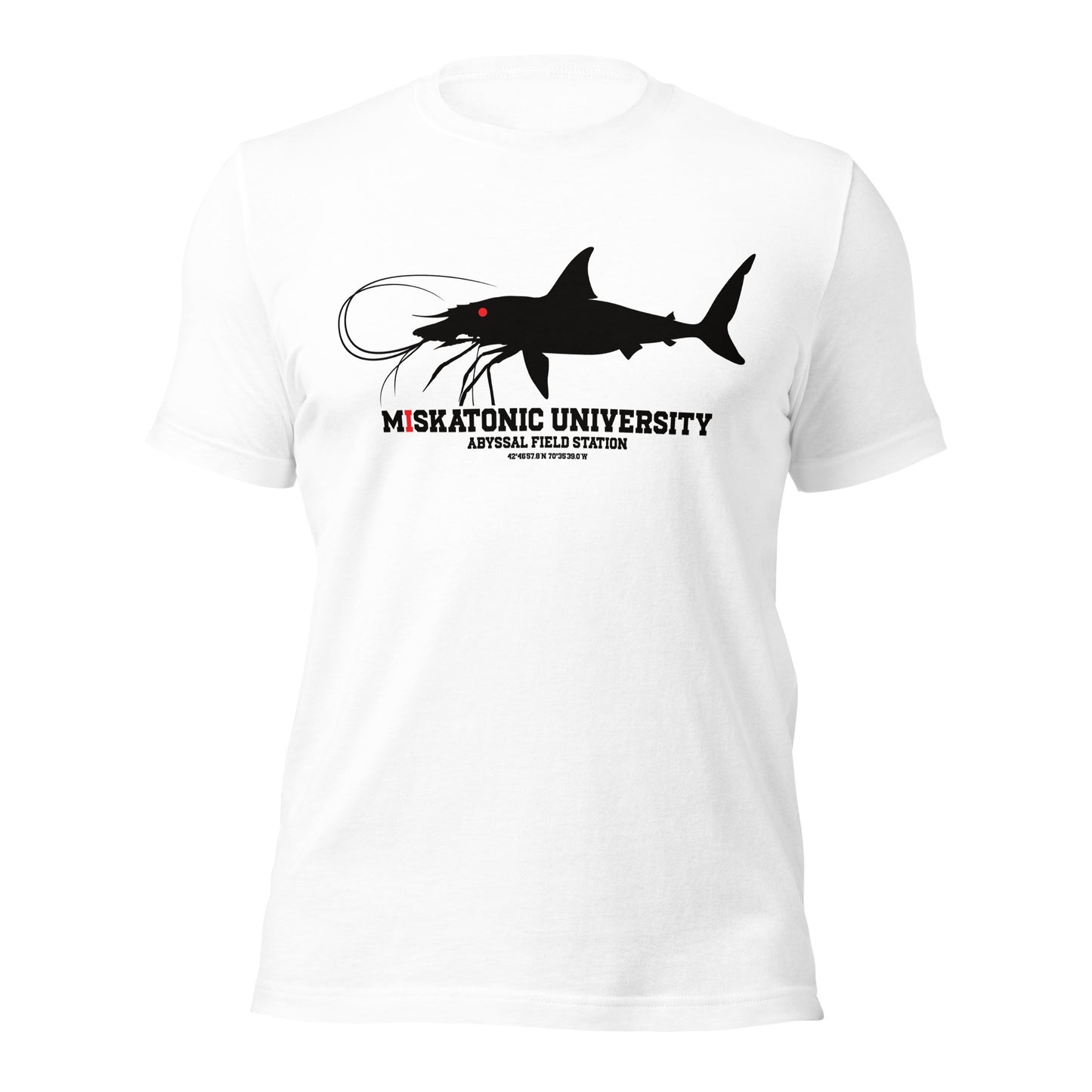 A stark emblem combining a shark‑bodied, shrimp‑headed hybrid with collegiate lettering for the Miskatonic University Abyssal Field Station. The graphic reads as an academic field‑station seal with unsettling maritime overtones, blending scientific authority and uncanny deep‑sea imagery. Ideal for branding, badges, or themed collections tied to Innsmouth lore.